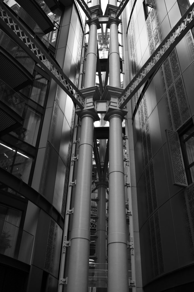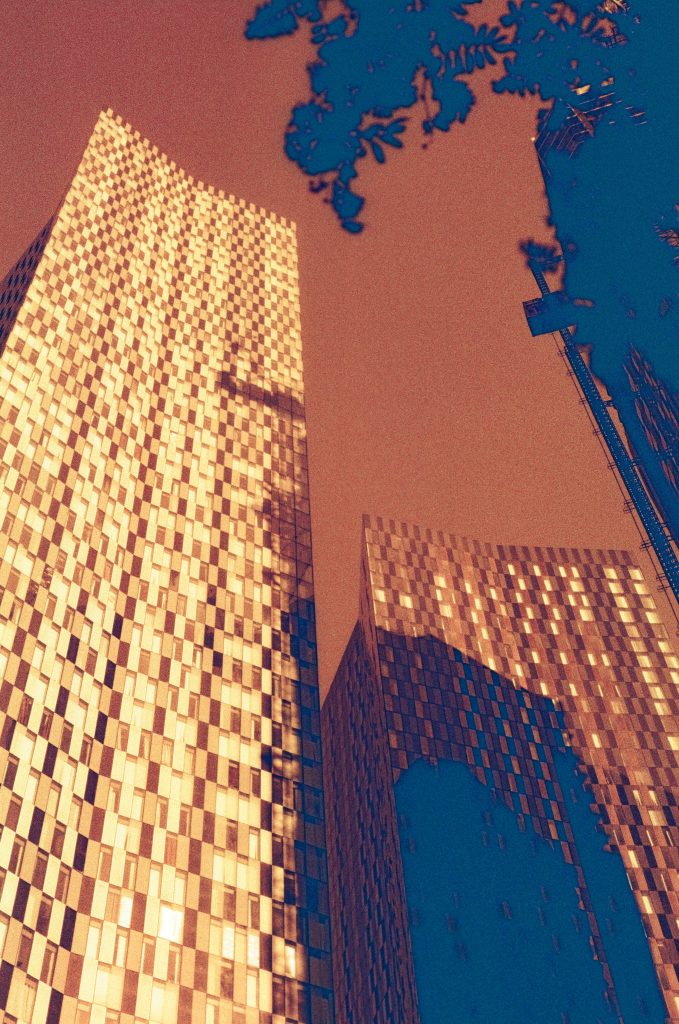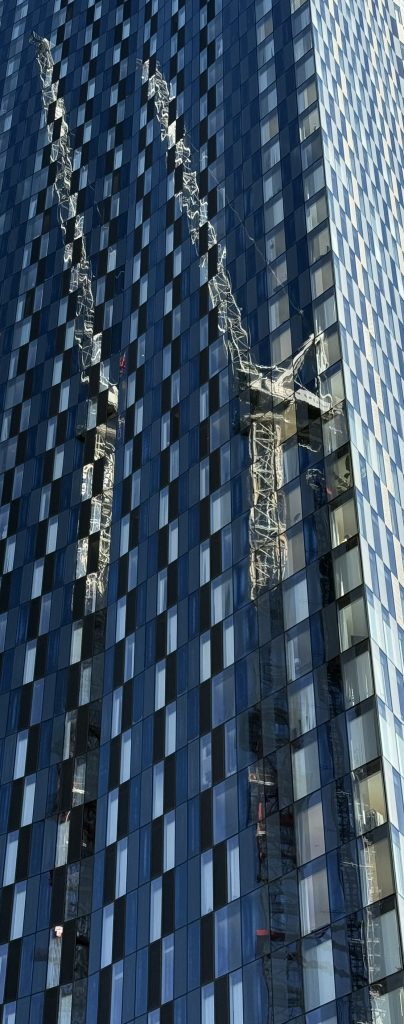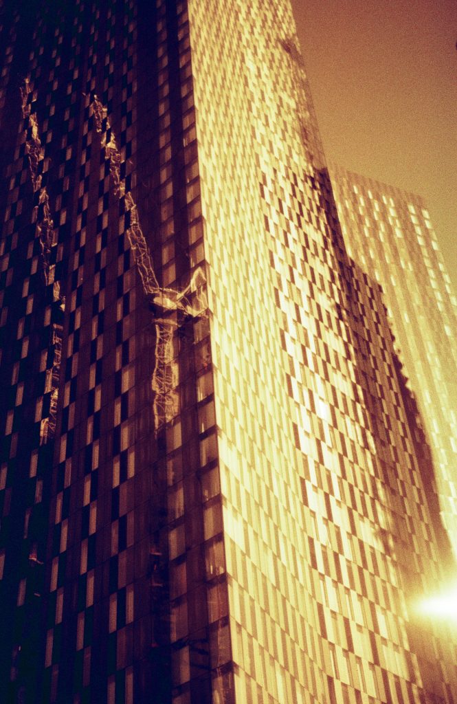 View of Deansgate Square towers through the old railway infrastructure of NT Castlefield